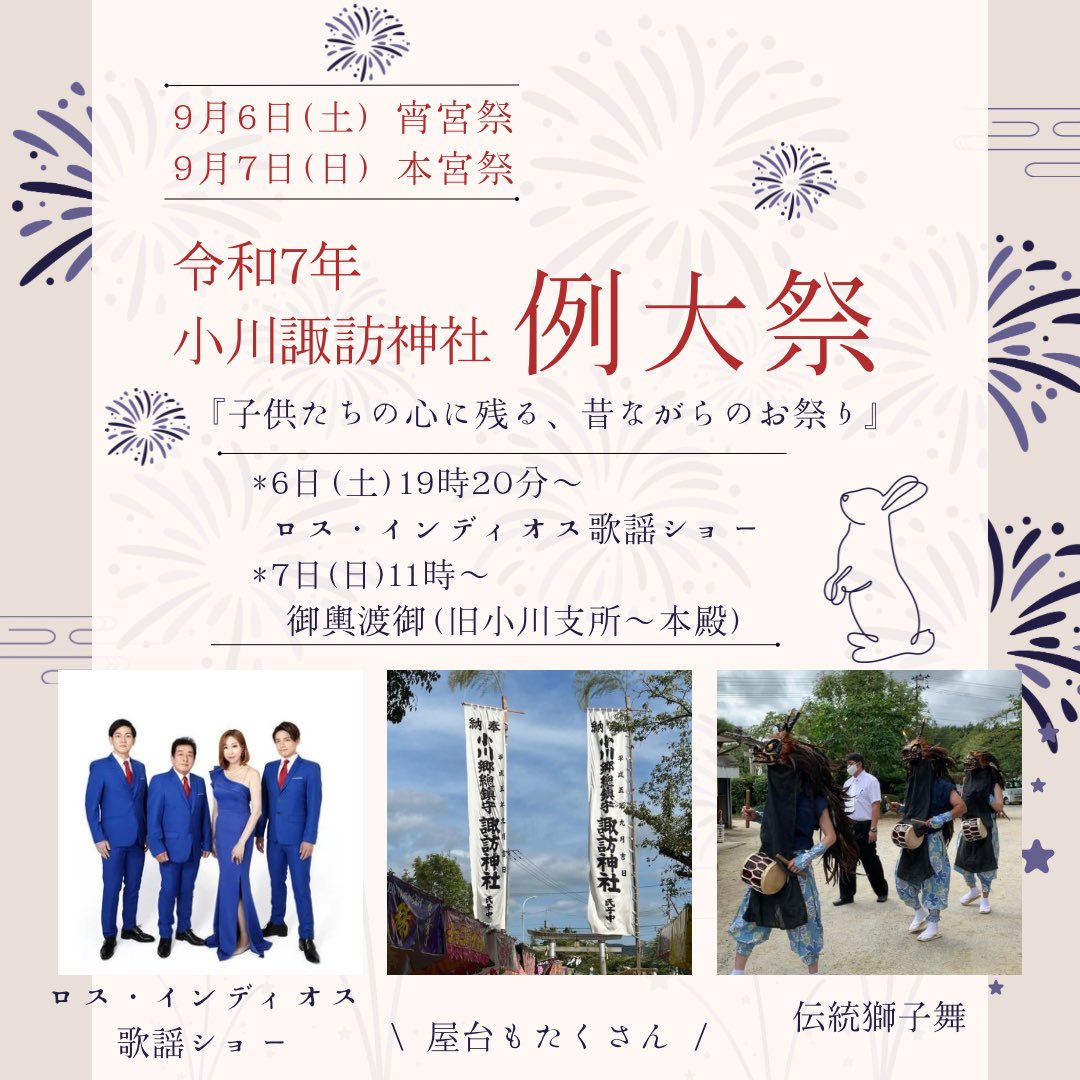 | 9月6日 | イベント!ロス・インディオス歌謡ショー 場所:小川調訪神社例大祭 住所:福島県いわき市小川町高萩家ノ前140-1 開演:19時20分〜 ![]() |