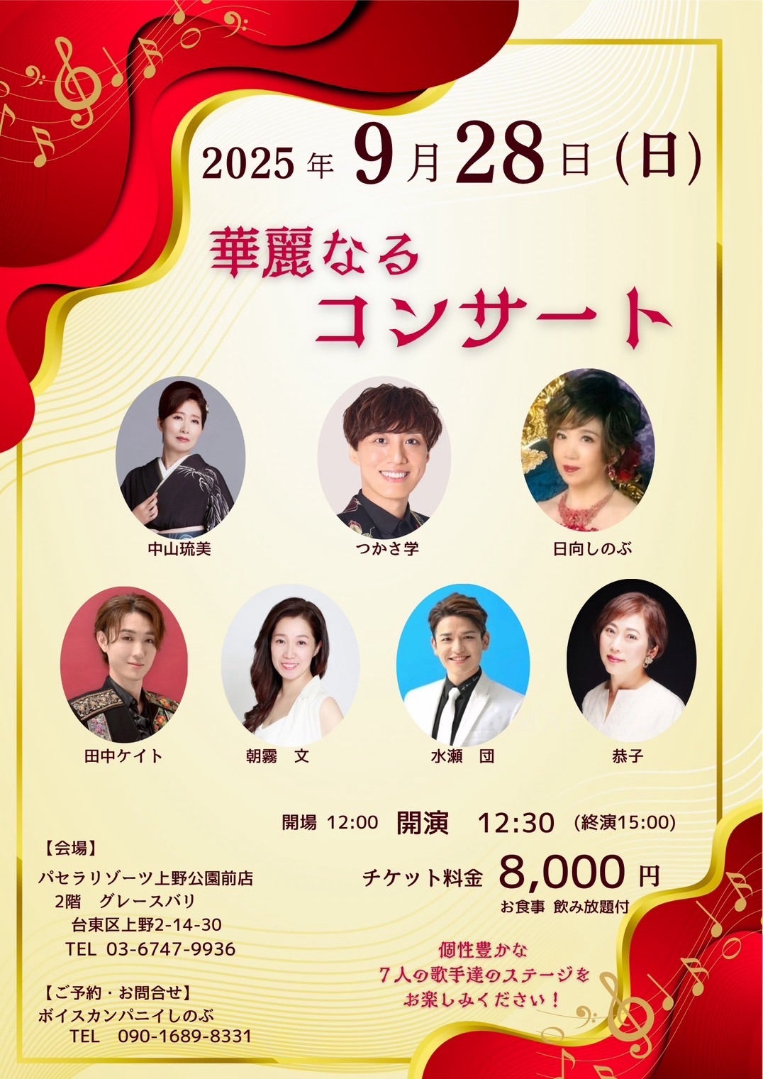| 9月28日 | ライブ!華麗なるコンサート 上野パセラ・水瀬団単独ステージ 会場:パセラリゾーツ上野公園前店2階 グレースバリ 住所:台東区上野2-14-30 開場:12:00 開演:12:30(終演15:00) 出演者:中山琉美、つかさ字、日向しのぶ、田中ケイト、朝霧文、水瀬団、恭子 ![]() |