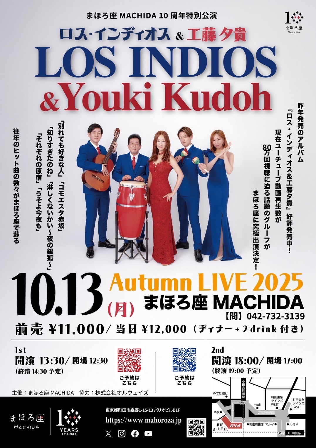 | 10月13日 | ライブ!ロス・インディオス & 工藤夕貴 オータムンライブ 会場:まほろ座 MACHIDA 昼の部 開場:12:30 開演:13:30 夜の部 開場:17:00 開演:18:00 前売 ¥11,000 / 当日 ¥12,000 ※指定席 ※ディナー+2Drink付き ①ウェルカムドリンク ②前菜 ③メイン ④デザート ⑤コーヒーor紅茶 ![]() |