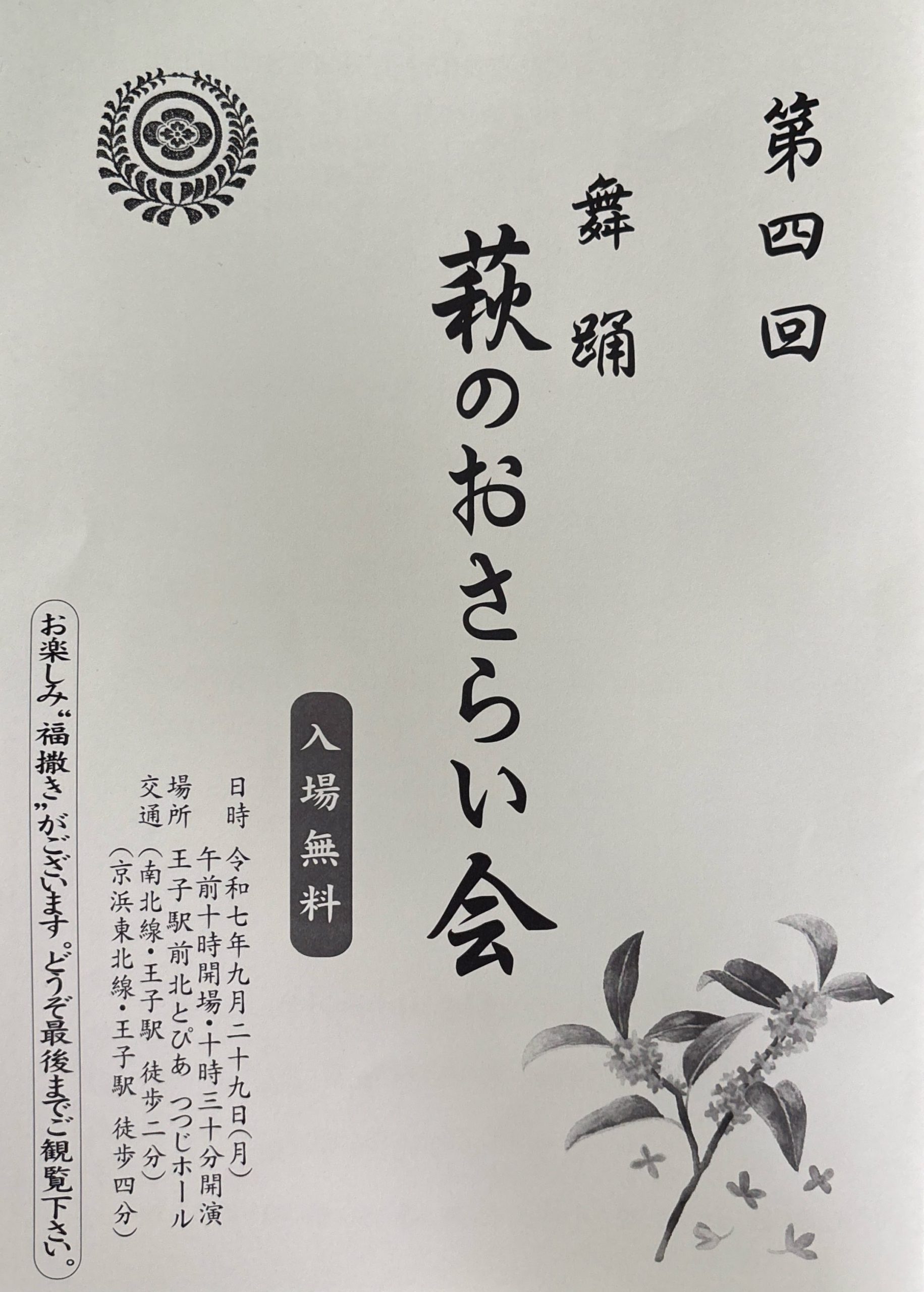 | 9月29日 | イベント!萩のおさらい会(水瀬団出演踊りステージ) 開場:10:00 開演:10:30 場所: 王子駅前北とぴあつつじホール 水瀬団の出番:演目51回、龍馬残影(美空ひばり)(13:00以降) ![]() |