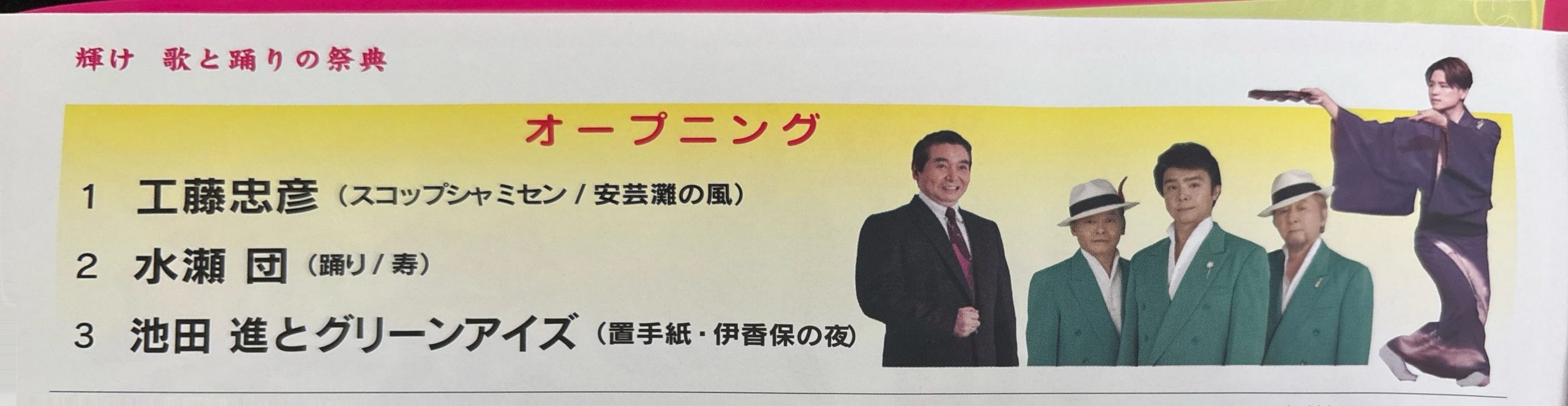 | 10月29日 | 令和6年能登半島地震被災地支援チャリティー 第51回歌謡祭 ~ 昭和100年、時代とともに生きた歌たち ~ ■10月29日(火)昼の部 11:30開場 12:00開演 東京・江戸川区総合文化センター大ホール 【司会】伍代夏子、合田道人 【出演】青山和子、青山 新、晃(フィンガー5)、大川栄策、小沢あきこ、小野由紀子、角川 博、金沢明子、北川裕二、九重佑三子、小柳ルミ子、城みちる、田辺靖雄、中村美律子、仁支川峰子、倍賞千恵子、畠山みどり、尾藤イサオ、藤本三重子、三田 明、三原綱木、三船和子、ロス・インディオス&ルミータ 明日香みき、あべさとこ、琴けい子、櫻井まり、関 大八、藤 和也、観月ゆうじ、毛利ゆき |
