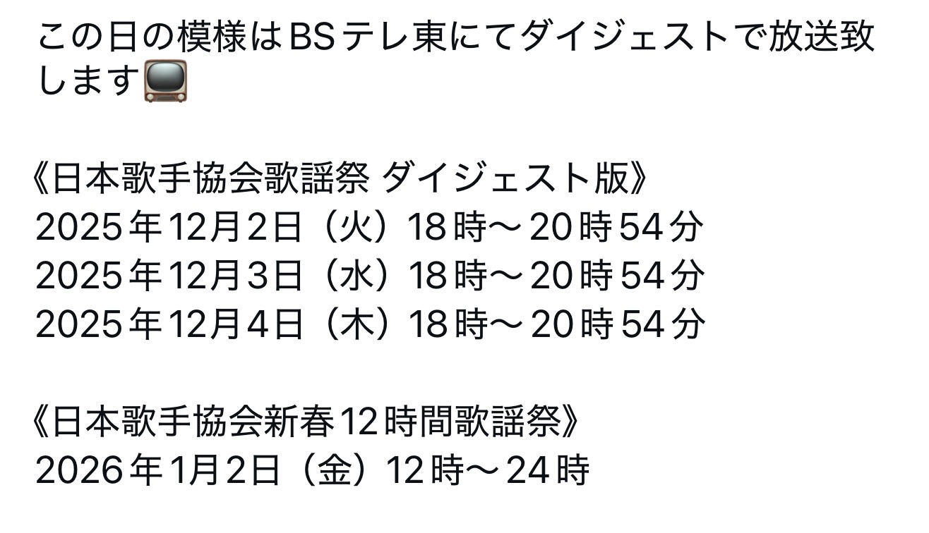 | 7月21~23日 | テレビ出演!<夏まつり 唄まつりダイジェスト版> 7月21日(月)17時56分~20時54分 第一夜 7月22日(火)17時56分~21時00分 第二夜 7月23日(水)17時56分~21時00分 第三夜 “昭和100年”往年の名曲熱唱🎤夏まつり唄まつり2025 |
