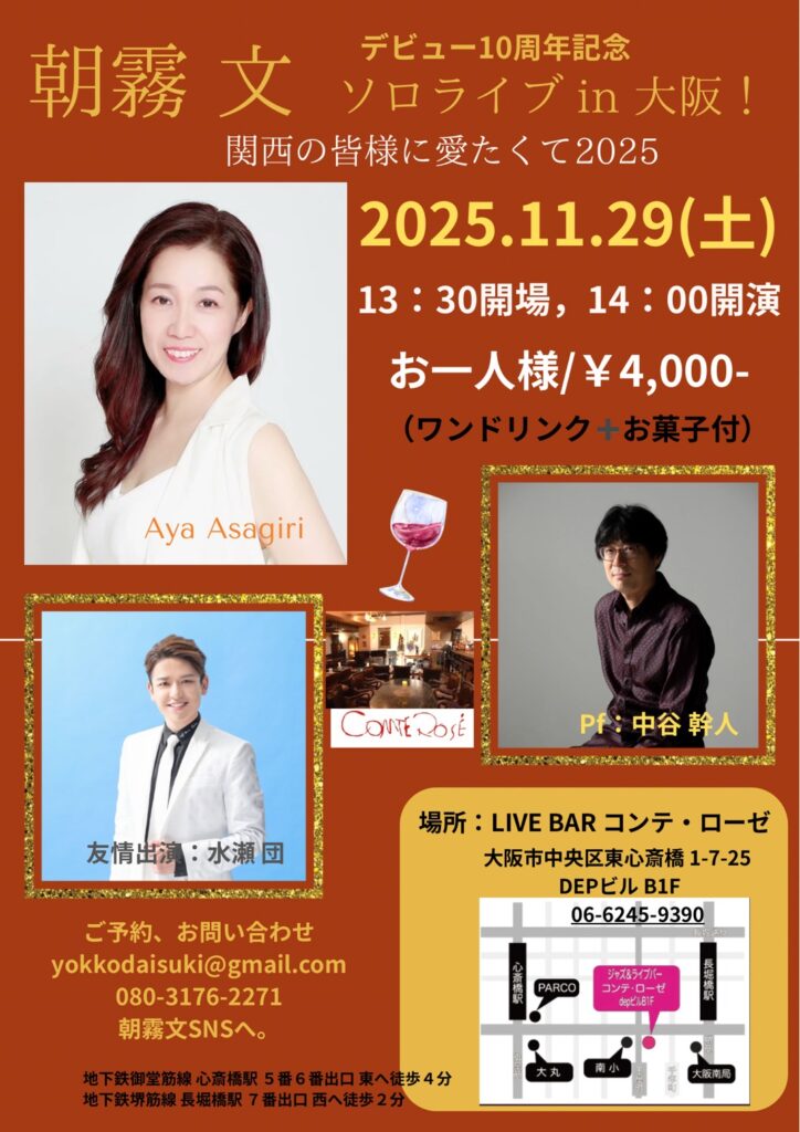 | 11月29日 | ライブ!朝霧文デビュー10周年記念 ソロライブ in 大阪! 13:30開場,14:00開演 お一人様/¥4,000-(ワンドリンク+お菓子付 友情出演:水瀬団 場所:LIVE BAR コンテ・ローゼ 大阪市中央区東心斎橋1-7-25DEPビル B1F 06-6245-9390 ![]() |